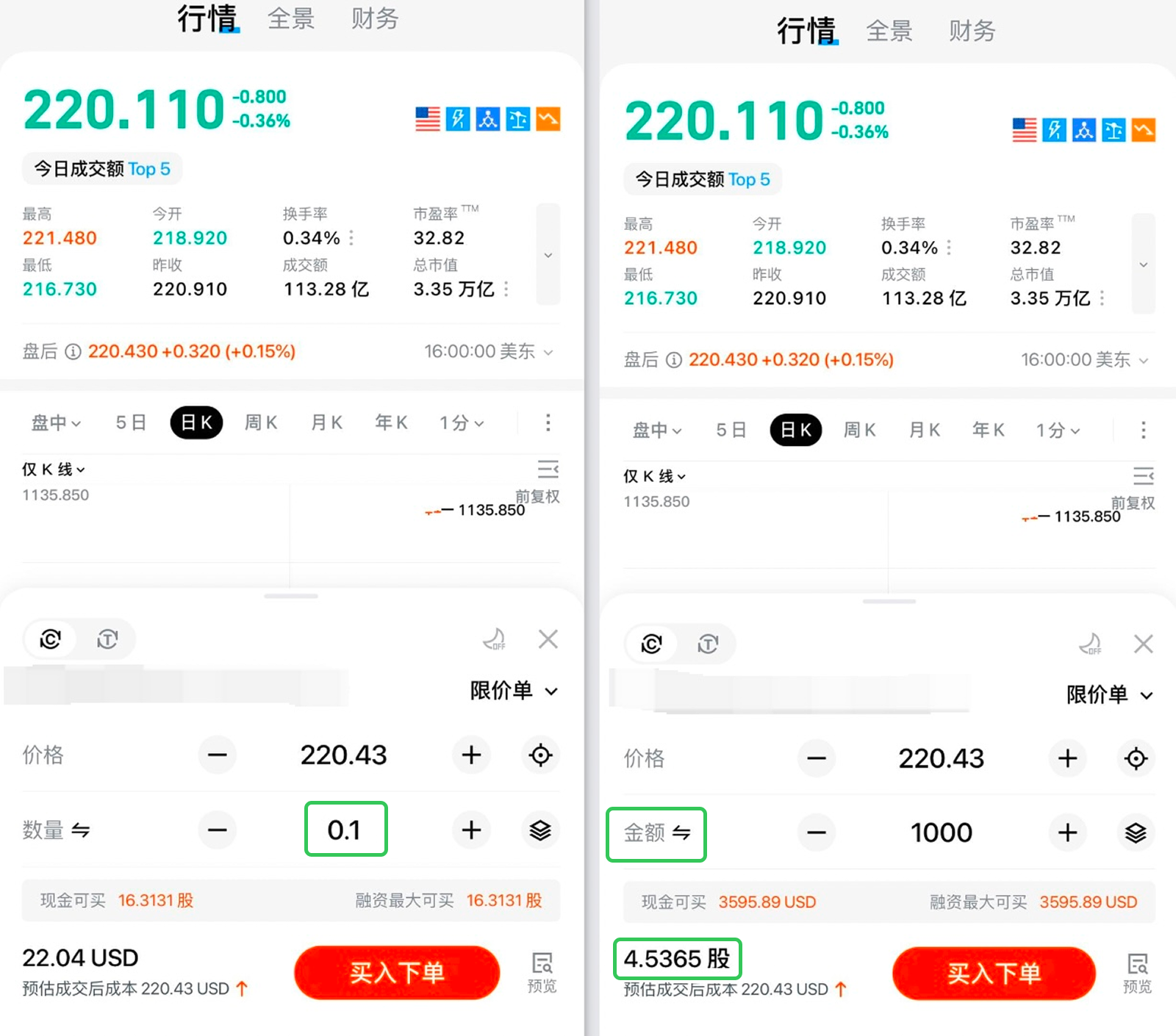 或選擇金額交易並輸入金額,系統將自動根據當前股價計算並轉換成相應的股份數量。